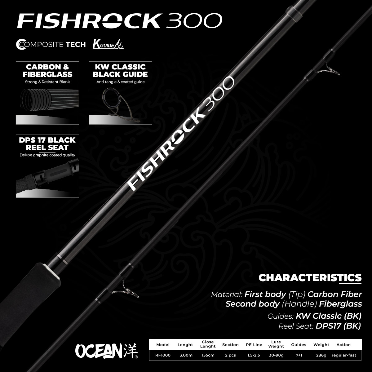 Introducing Ocean® brand’s entry-level powerhouse—the FISHROCK 300. Specially designed for fishing from rocky coasts and shores, this rod features a hybrid blank: a sturdy fiberglass base reinforced with a 24-ton full carbon tip section. At 3.0 meters long and split into two sections for easy transport, it weighs only 286g, offering excellent portability without compromising strength.